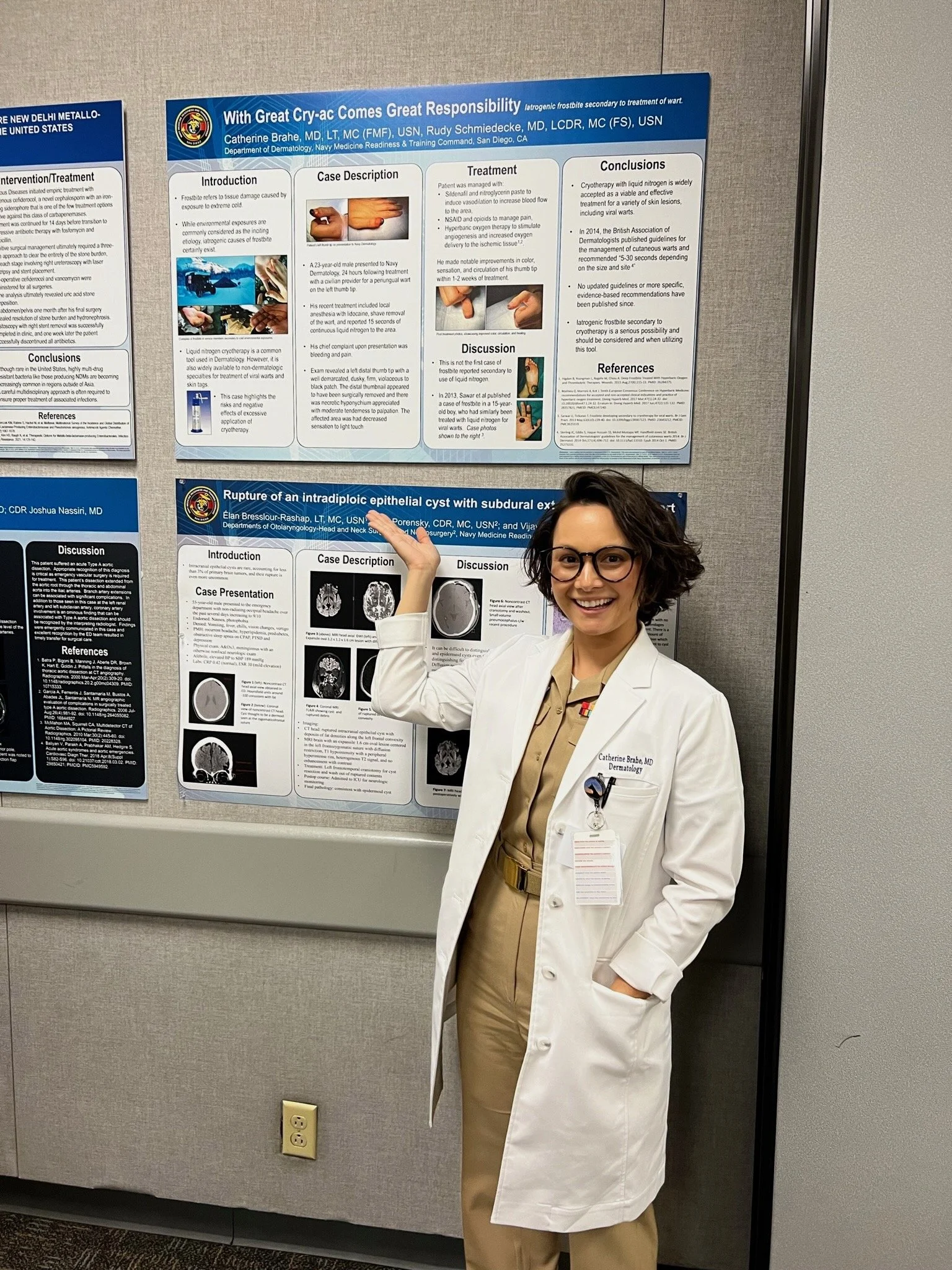 Following her tour in Camp Lejeune, Dr. Brahe was selected as one of three Dermatology residents, Navy wide, and began her specialty training as a Dermatology resident at Naval Medical Center San Diego. She has numerous medical publications and has received multiple research and patient satisfaction awards. During her residency she was selected for early promotion from Lieutenant to Lieutenant Commander and was also selected to serve as chief resident in her senior year.